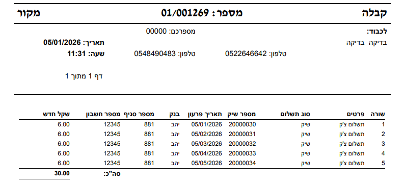When generating a receipt or Document Type 2 (חשבונית מס קבלה), a payment object is required. Each payment method has specific mandatory fields in addition to the standard requirements for Receipt.New and Document.New .